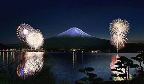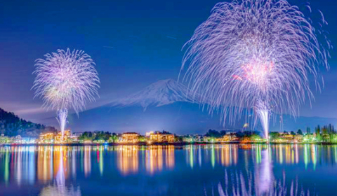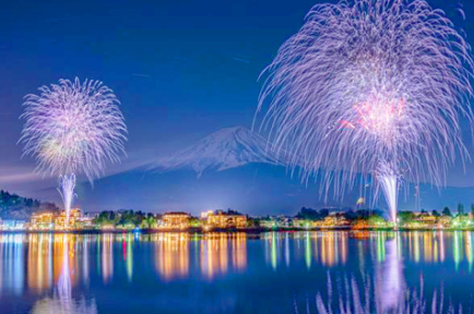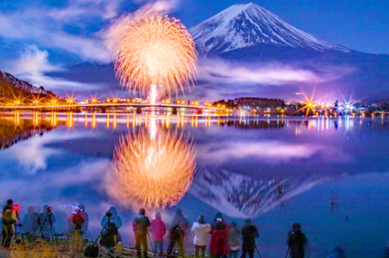 風もなく、湖面が穏やかな時には、河口湖に映る「逆さ花火」もきれいに見ることができます。